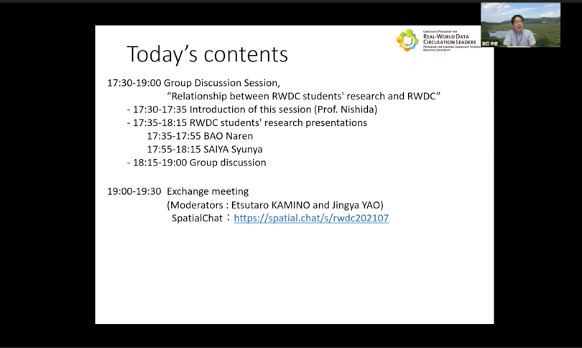 Students of RWDC leading program requested to include a chapter in their PhD dissertation that discusses the relationship between their research and real-world data circulation. In this regard, RWDC students explain their research and then discuss the relationship with the real-world data circulation and the social value created by the real-world data circulation. It will be a meaningful opportunity to think about the real-world data circulation in the RWDC students' own research. First, Professor Naoki Nishida explained the purpose of this session. Next, the two RWDC students introduced their research and explained their relationship with the real-world data circulation. Finally, the students and mentors were divided into two groups to have a heated discussion about the research of the introduced students.