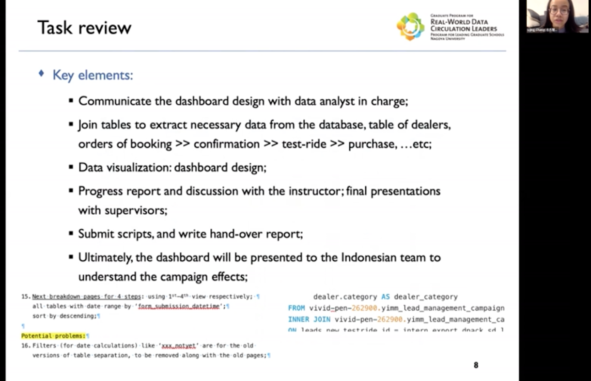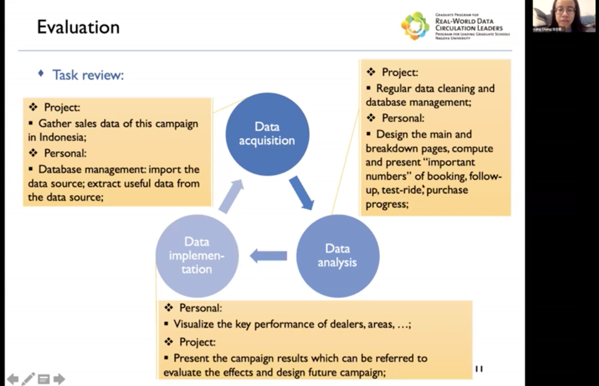 From the plenary meeting of November 2021, we started a special lecture series in which former RWDC faculty members who have been educating and managing in the RWDC leading program, and graduates of the RWDC leading program, would give us a one-hour lecture about their recent activities and their messages to RWDC students. The purpose of this lecture series is to provide an opportunity to activate their activities by receiving a message from former RWDC faculties and RWDC graduates by reflecting the recent trend that the students who have recently joined RWDC leading program may not be able to sufficiently motivated to interact with each other. At this plenary meeting, Dr. ZHOU Wenbin, who successfully completed this program last year, and is currently working at May Mobility, gave a lecture.
