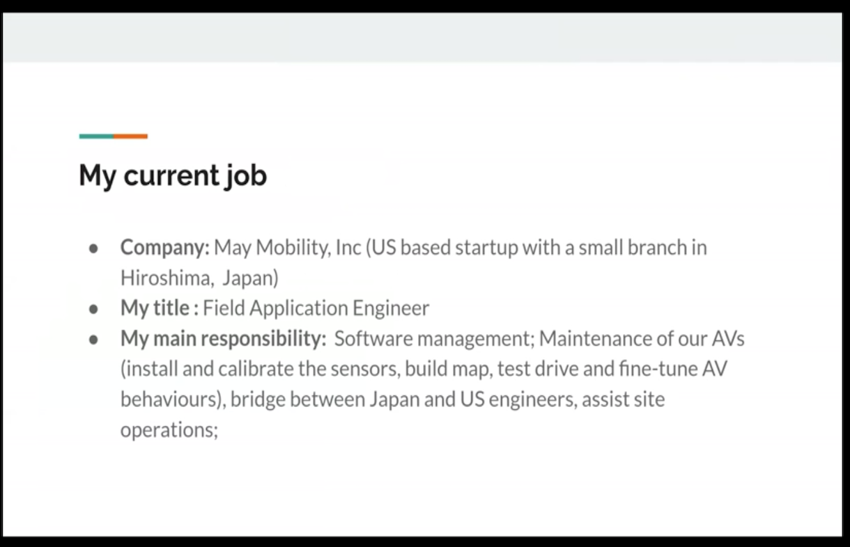 | Presenter | ZHOU Wenbin (May Mobility; RWDC graduate (3rd generation member)) |