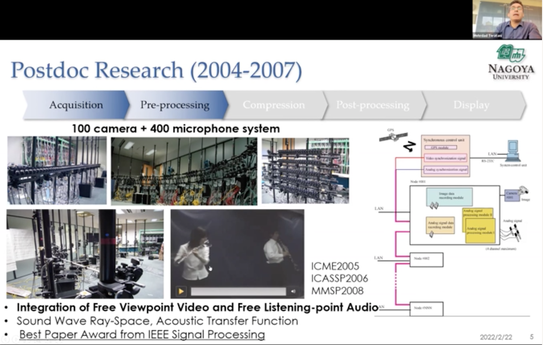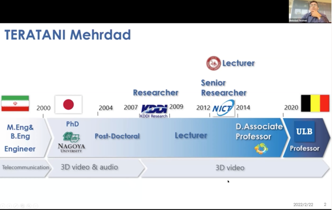 From the plenary meeting of November 2021, we started a special lecture series in which former RWDC faculty members who have been educating and managing in the RWDC leading program, and graduates of the RWDC leading program, would give us a one-hour lecture about their recent activities and their messages to RWDC students. The purpose of this lecture series is to provide an opportunity to activate their activities by receiving a message from former RWDC faculties and RWDC graduates by reflecting the recent trend that the students who have recently joined RWDC leading program may not be able to sufficiently motivated to interact with each other. At this plenary meeting, as a specially appointed faculty member, he was instrumental in the management and education of this reading program from the launch of this program to two years ago. Prof. Mehrdad Teratani, who is now working at University of Brussels, gave a lecture.