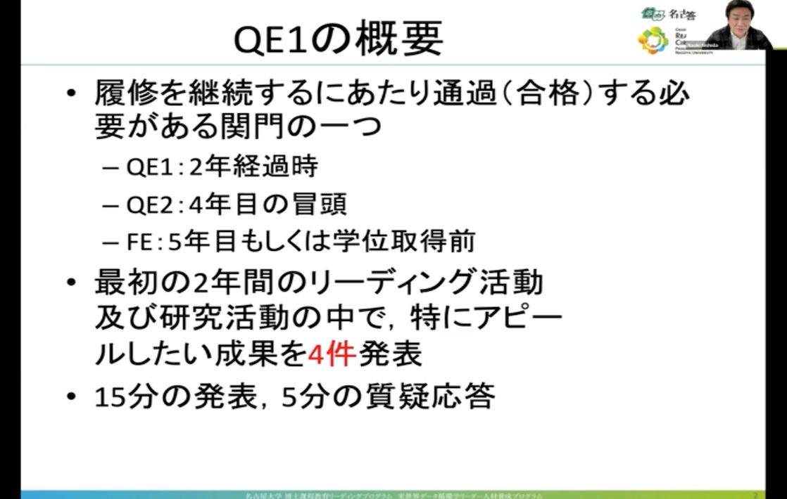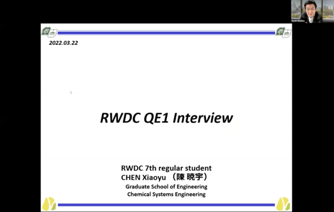 In the RWDC leading program, Qualifying Examination 1, QE1, is performed at the timing of completing the master's course and advancing to the PhD course, or at the timing when the activity of the RWDC leading program has passed two years. In QE1, students will present their activities at the RWDC leading program and their research activities, and explain which of the seven types of skills, viewpoints, are acquired in each activity. After QE1, the program will decide whether it is worth continuing to join as a RWDC leading student after that. At this month's plenary meeting, three RWDC students gave their QE1 presentation.