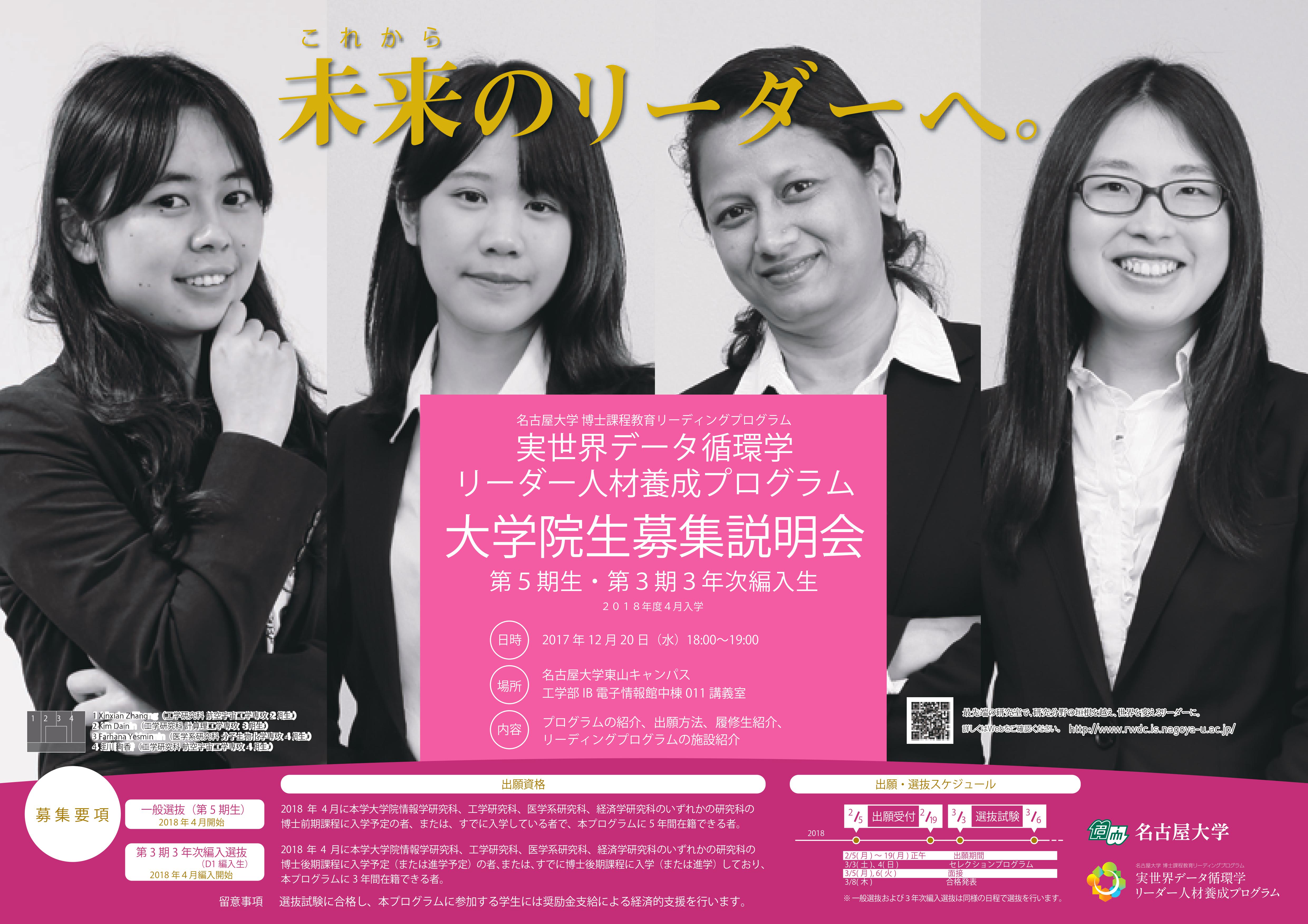 | 連絡先 | 名古屋大学情報科学研究科・リーディング大学院事務室 TEL: 052-789-3171 Email: office::rwdc.is.nagoya-u.ac.jp |