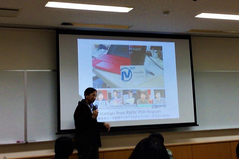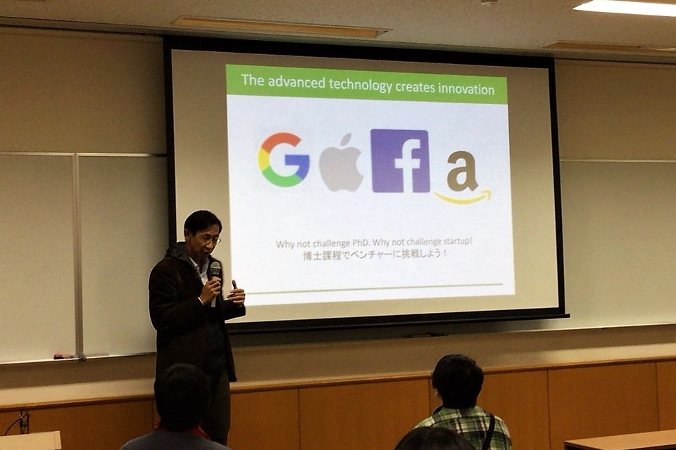 武田教授は人工知能技術をはじめとする技術革新により人々の「仕事」の変化が求められる時代の中で新たな価値を創造することの重要性について話された後、実際にベンチャーを起こし活躍する履修生やそれを支える本プログラムのカリキュラムについて紹介しました。