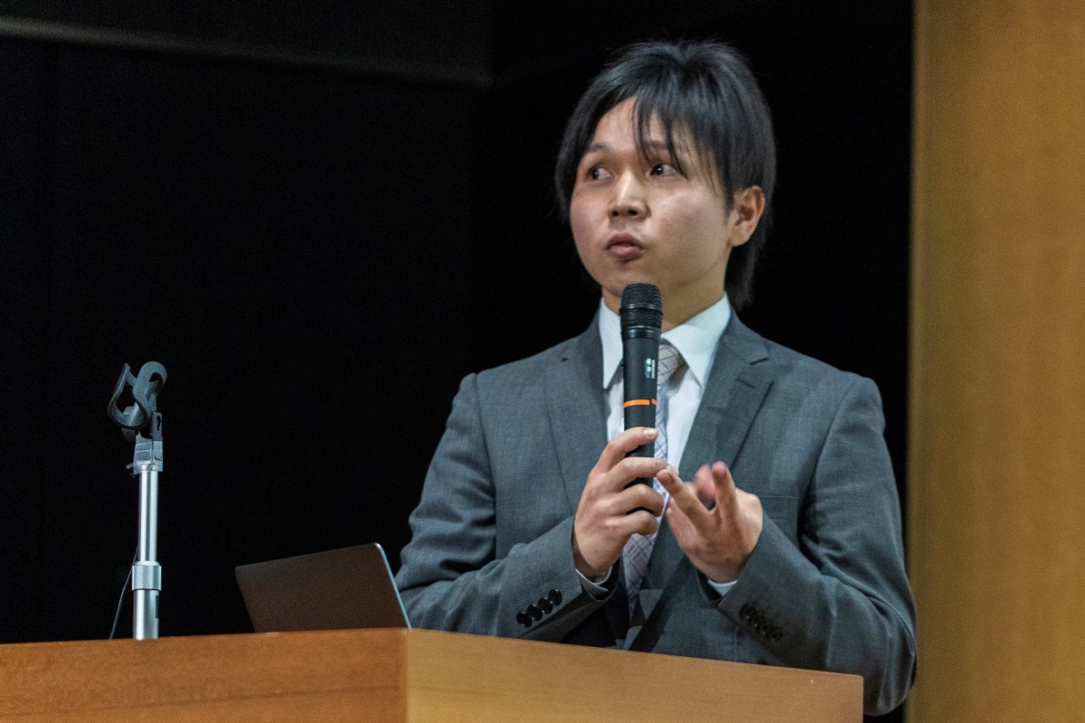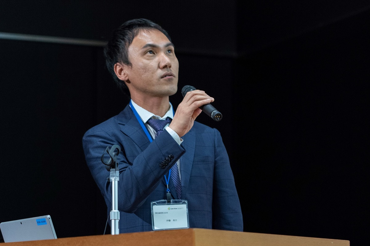 産学連携プロジェクトの一つ目の事例として、豊田通商株式会社と共同で行った産学連携プロジェクト組成プログラムにおける取り組みが紹介されました。 伊藤勇介様からは、今回取り組んだ研究プロジェクト「養鶏事業データ活用案件」の概要、ビジネス課題、プロジェクトの成果についてご紹介いただきました。 第二期生の関さんは、提供されたデータの概要、プロジェクト全体の流れ、データ解析で得られたビジネス知見などについて説明しました。 また、今回のプロジェクトを通して得られた経験として、チームでの開発経験や企業でのビジネスの進め方を体験できたことを挙げていました。