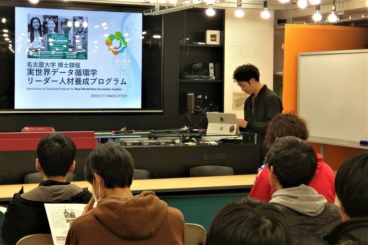 その後、参加者はリーダーズスタジオ/サルーンに移動して神野さんからデータ循環学の考えや各プログラムの内容、学生の活躍などの説明を受けました。