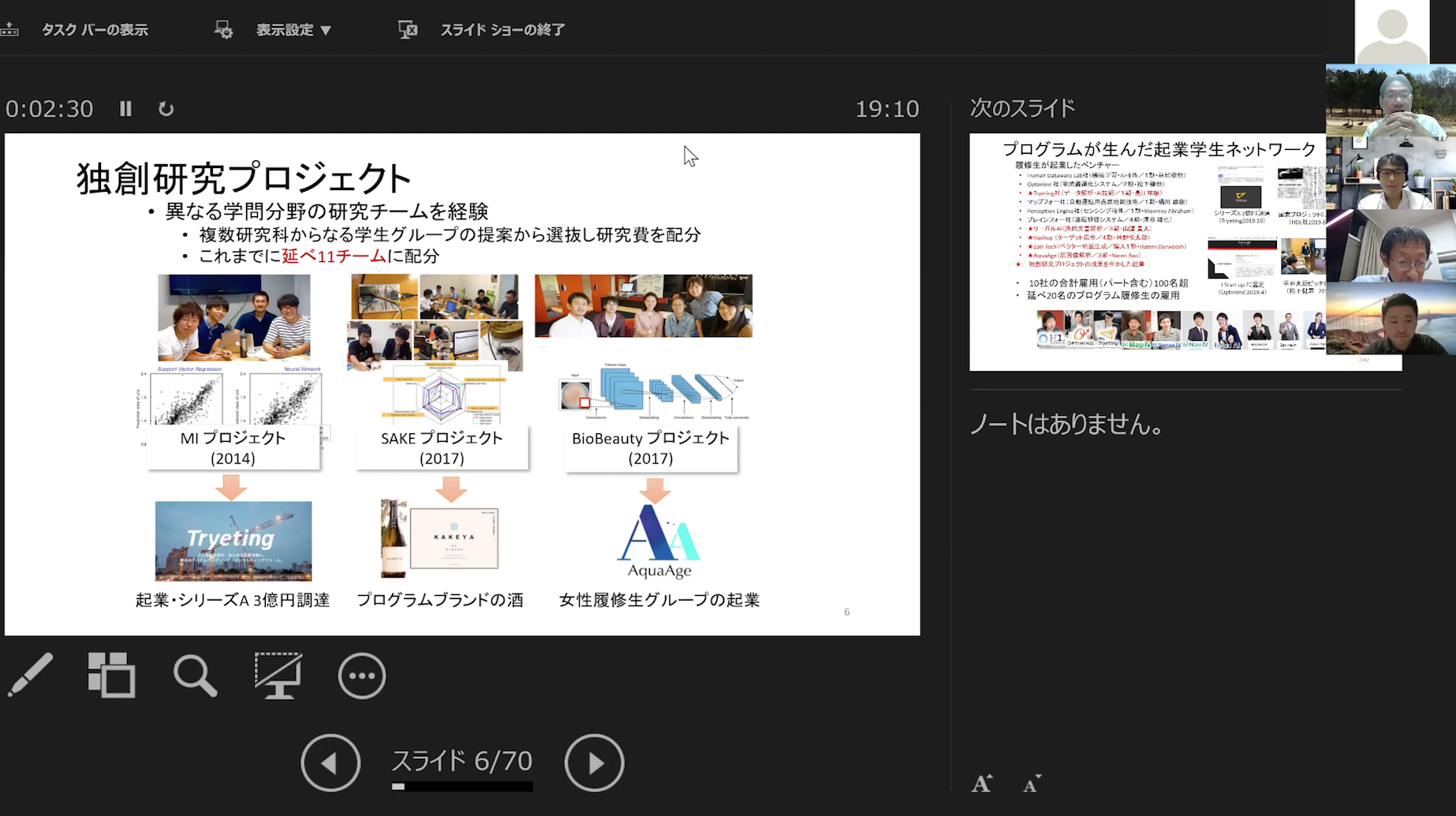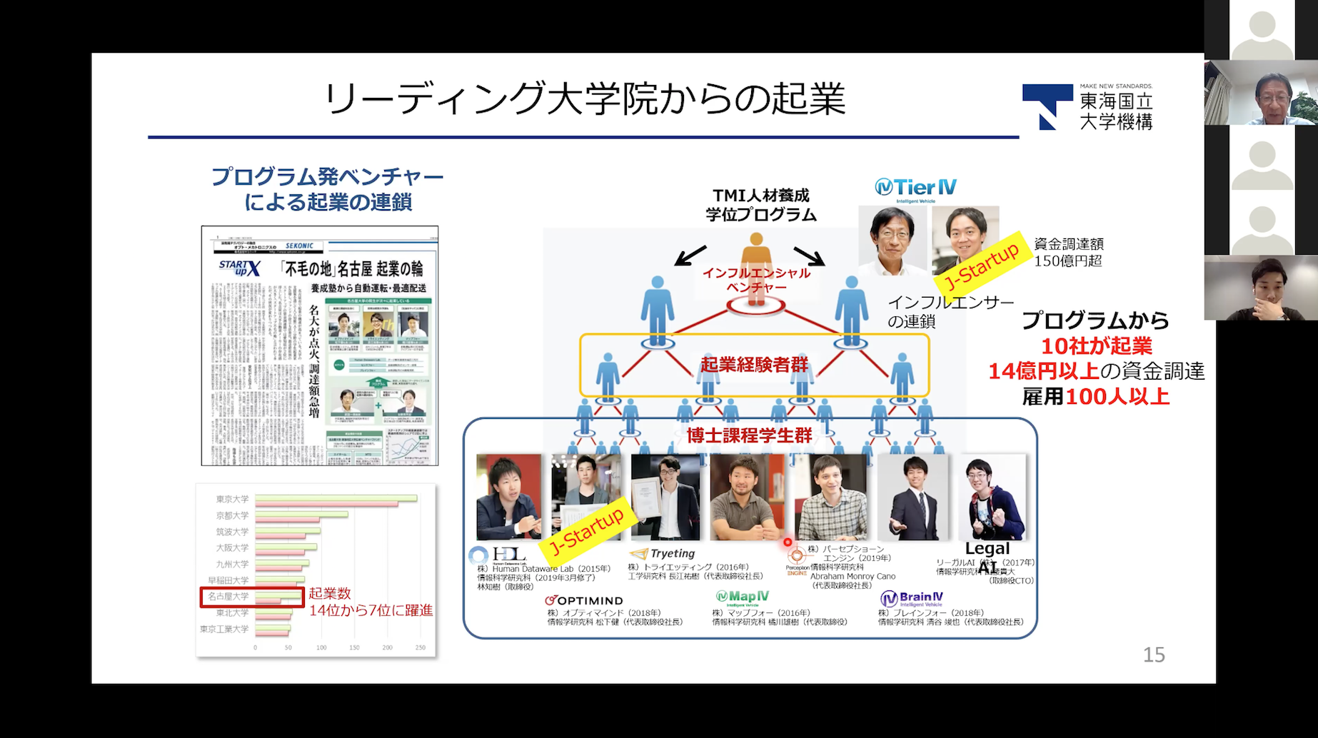 名古屋大学博士課程教育リーディングプログラム「実世界データ循環学リーダー人材養成プログラム」で10を超えるベンチャー企業が10億円を超える価値を生み出し、その成果を核に「実世界データ演習」を通じて育成された人材を地域経済界や三重大学・広島大学と連携した東海国立大学機構へ展開する取り組みと成果が紹介されました。
