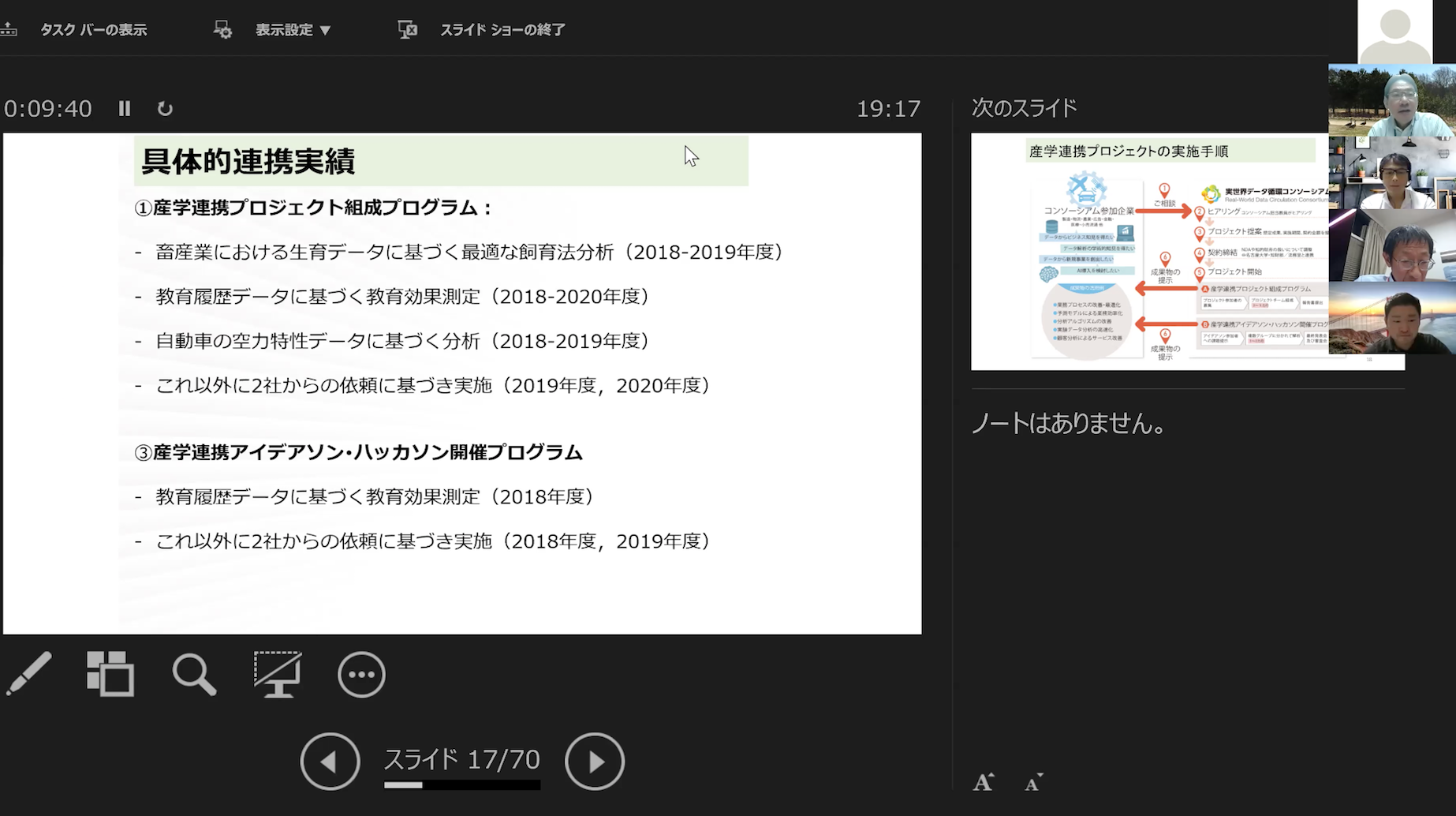 名古屋大学数理・データ科学教育研究センターの中岩浩巳特任教授が産業界との共創による課題解決型人材育成の成果を紹介しました。発表では、「実世界データ循環学リーダー人材養成プログラム」、「実世界データ循環コンソーシアム」および「実践データサイエンティスト育成プログラム」この三つのプログラムの育成実績について紹介しました。まずは三つのプログラムにおける各自の取り組みについて説明しました。次に、実績に関する二つの具体的な事例を紹介しました。ベネッセコーポレーションの「資質・能力の伸びに効果的な学習の在り方に関する研究」とセイノー情報サービスの「LLP(Lead Logistics Provider)オペレーション作業予測・要員配置」この二つの事例について仮説、データの分析結果および考察を説明しました。