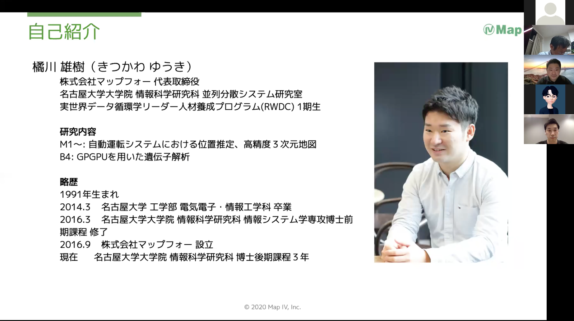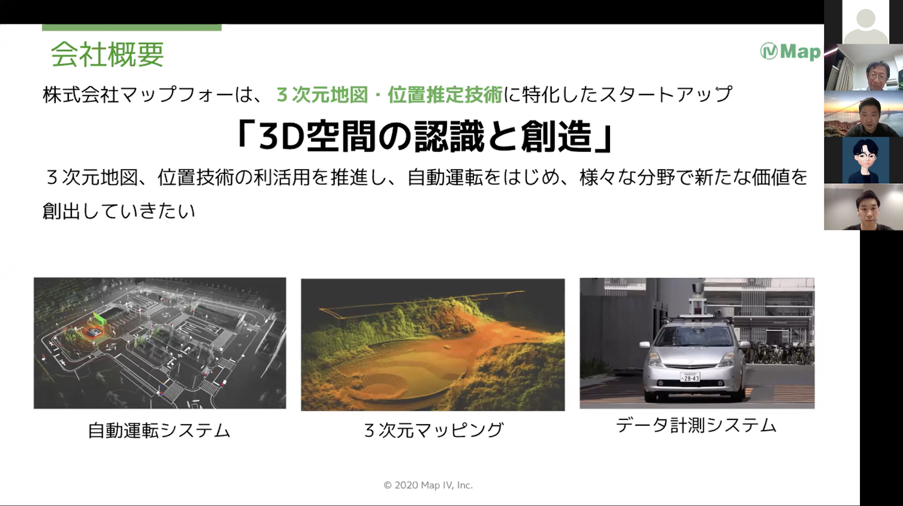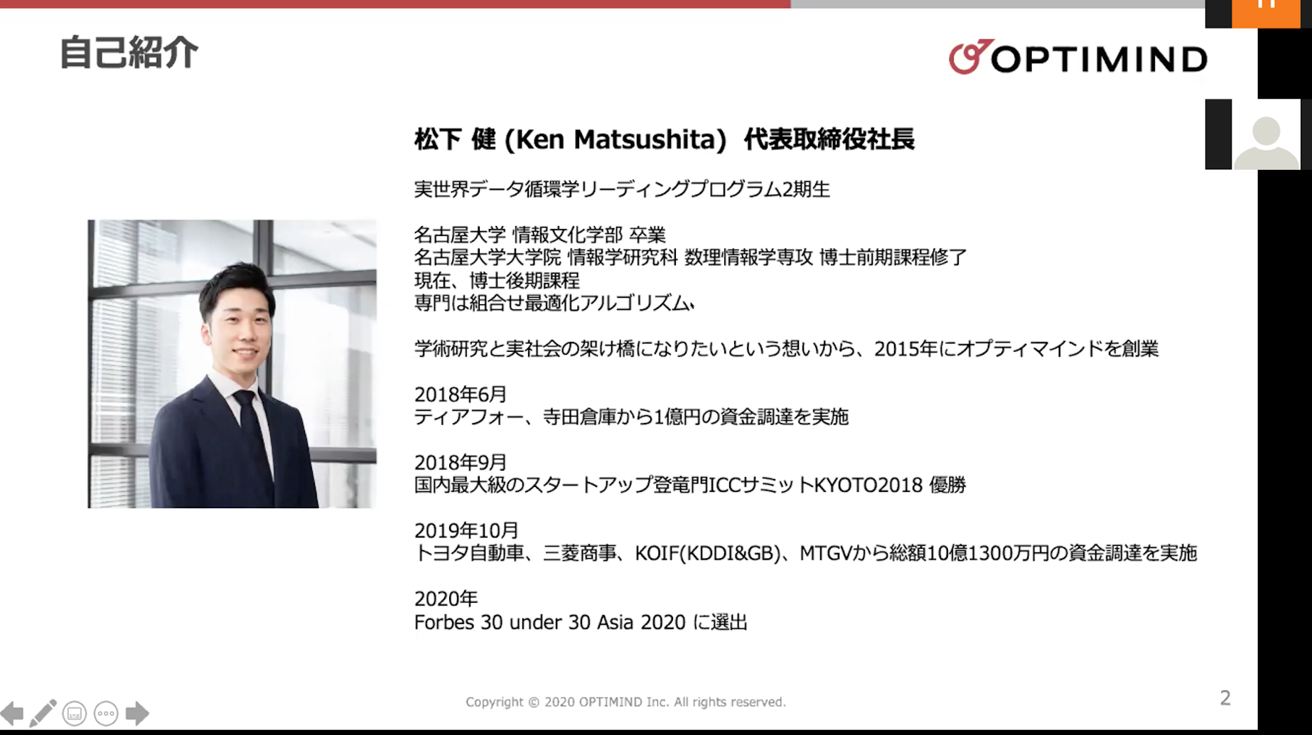 まずは「実世界データ循環学リーダー人材養成プログラム」の2期生の松下健が「株式会社オプティマインド」を紹介しました。発表では会社概要から、自社のラストワンマイルのルート最適化の事業内容まで説明しました。次に、「実世界データ循環学リーダー人材養成プログラム」の1期生の長江祐樹が「株式会社トライエッティング」を紹介しました。発表では簡潔な自己紹介から始めて自社概要を経て、ノーコードAIクラウドで業務を自動化する事業内容を説明しました。最後に、「実世界データ循環学リーダー人材養成プログラム」の1期生の橘川雄樹が「株式会社マップフォー」を紹介しました。発表では自社の3次元地図・位置推定技術に特化した事業の特徴について説明しました。また自社の事業が実世界データ循環との関係性も説明しました。