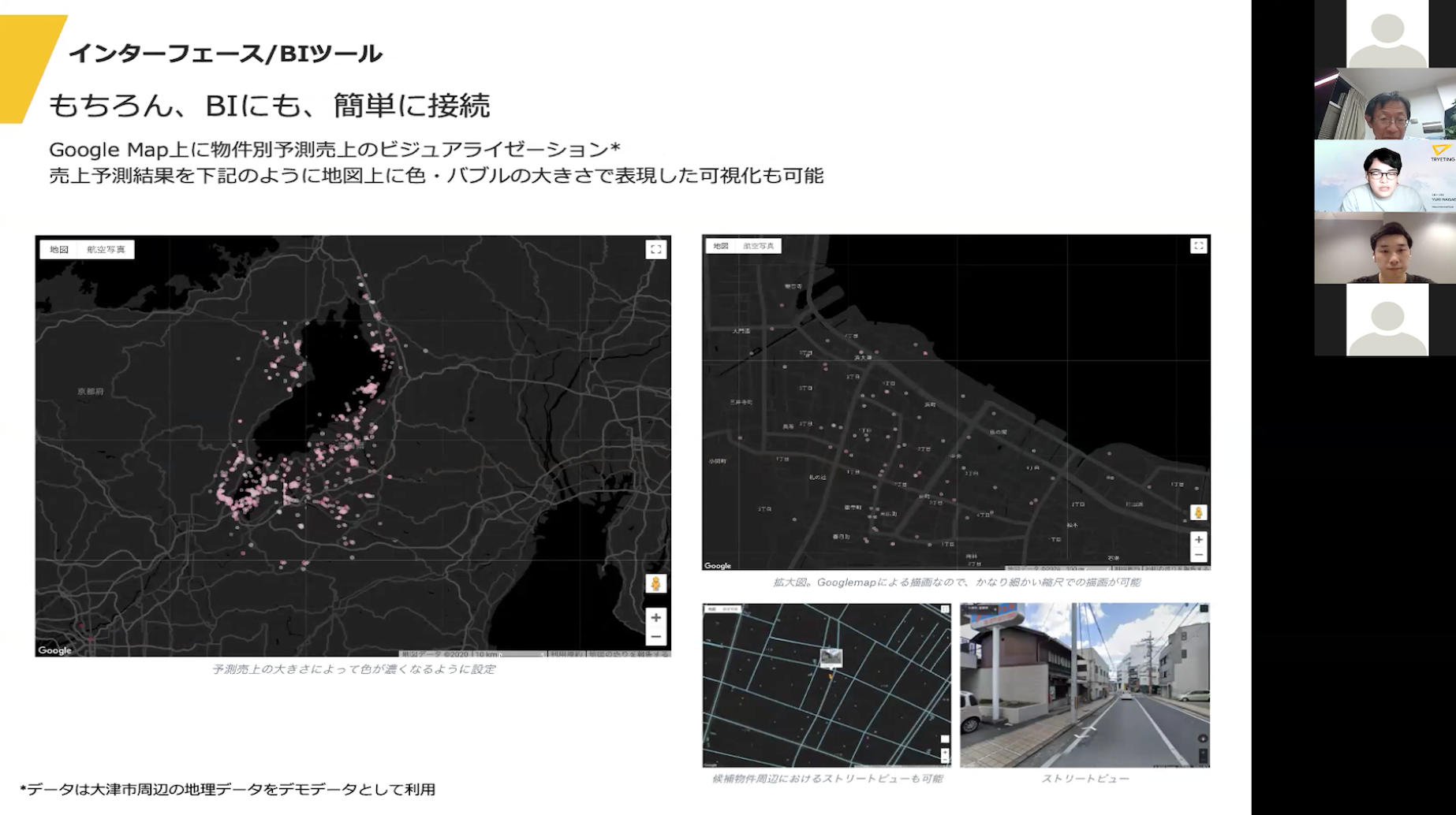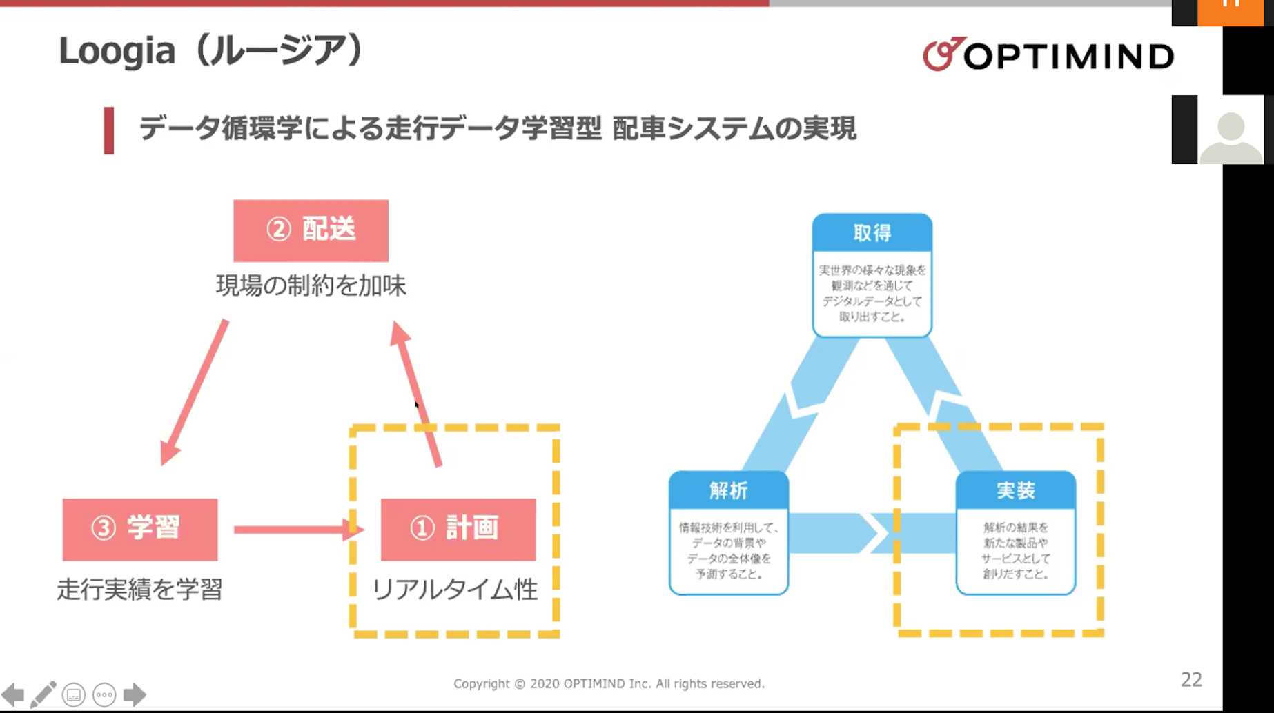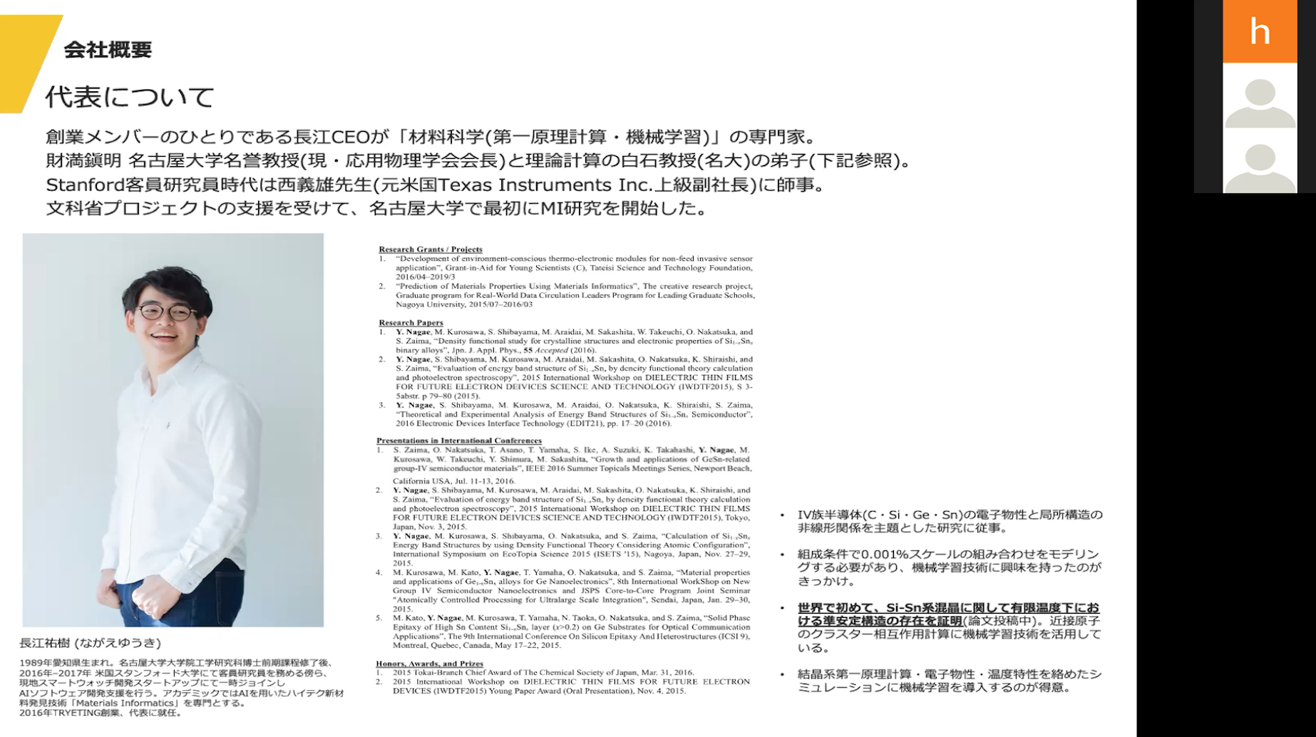 まずは「実世界データ循環学リーダー人材養成プログラム」の2期生の松下健が「株式会社オプティマインド」を紹介しました。発表では会社概要から、自社のラストワンマイルのルート最適化の事業内容まで説明しました。次に、「実世界データ循環学リーダー人材養成プログラム」の1期生の長江祐樹が「株式会社トライエッティング」を紹介しました。発表では簡潔な自己紹介から始めて自社概要を経て、ノーコードAIクラウドで業務を自動化する事業内容を説明しました。最後に、「実世界データ循環学リーダー人材養成プログラム」の1期生の橘川雄樹が「株式会社マップフォー」を紹介しました。発表では自社の3次元地図・位置推定技術に特化した事業の特徴について説明しました。また自社の事業が実世界データ循環との関係性も説明しました。