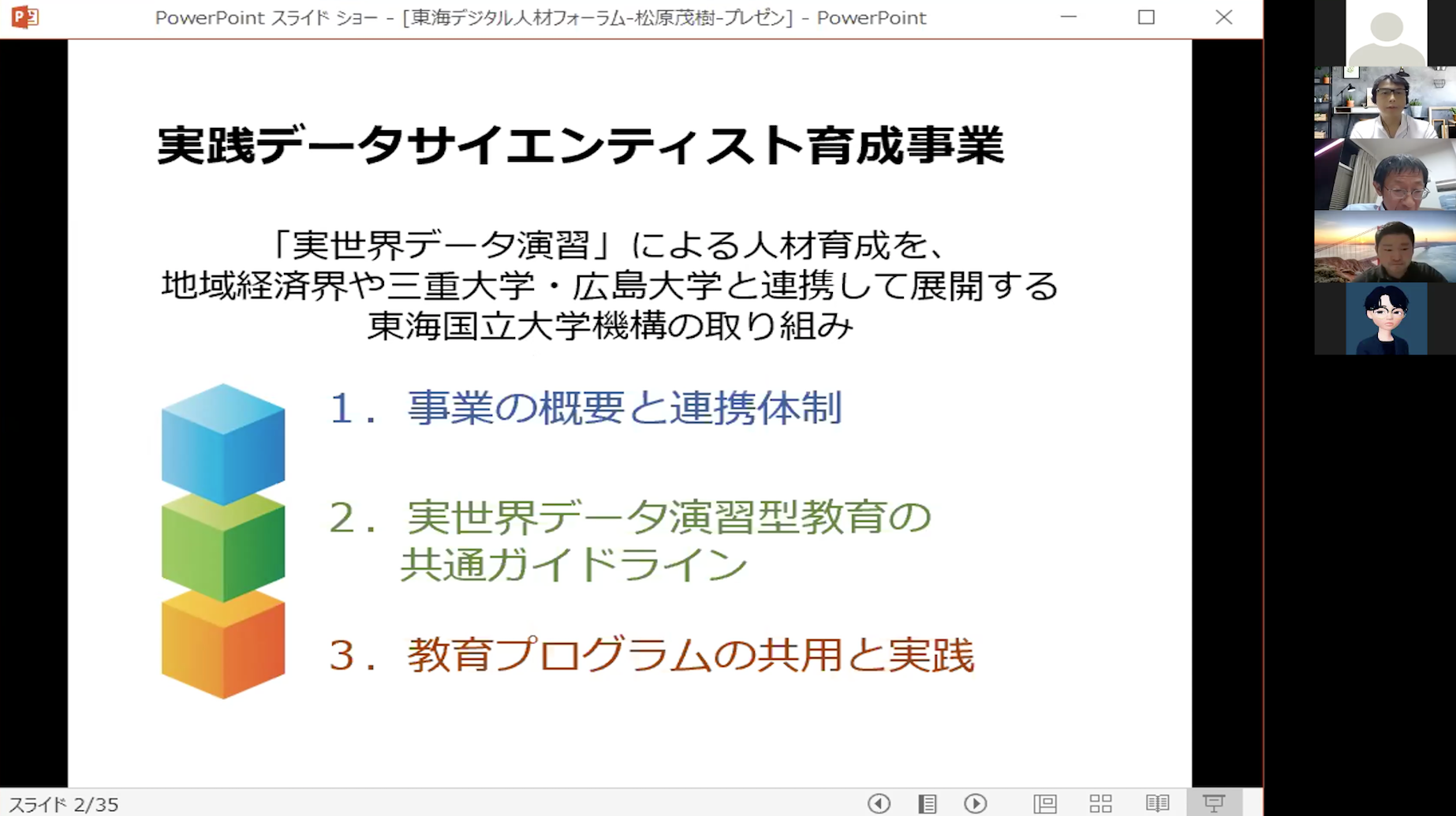 名古屋大学情報戦略室の松原茂樹教授が「実践データサイエンティスト育成事業」の取り組みについて紹介しました。発表では、まず「実践データサイエンティスト育成事業」の事業概要と連携体制を説明しました。次に、実世界データ演習型教育の共通ガイドラインを説明しました。最後に教育プログラムの共用と実践を紹介しました。