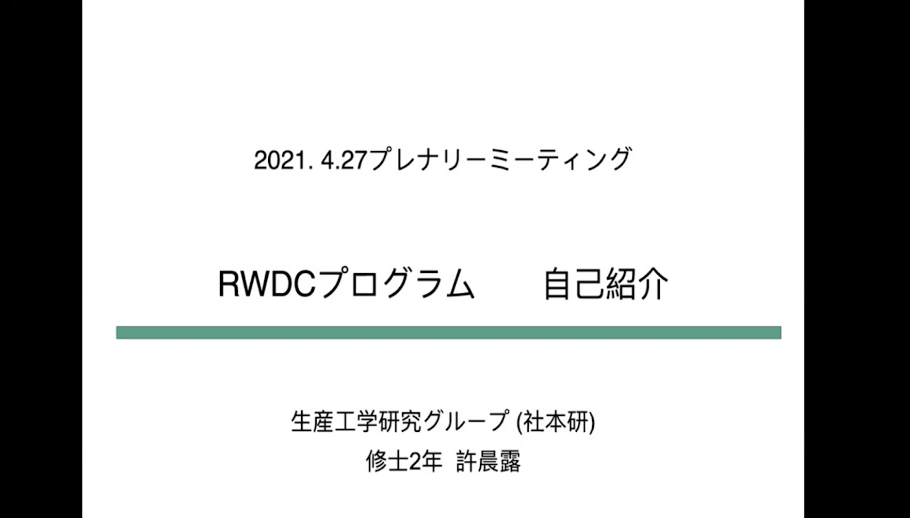 4月のPlenary Meetingでは、武田一哉教授により新年度のご挨拶、Victor MUHANDIKI先生によりお別れのご挨拶、プログラムに新しく加入した筒井先生により就任のご挨拶、8期生により自己紹介およびRWDC履修生による特別企画「Signate」への挑戦が行われました。