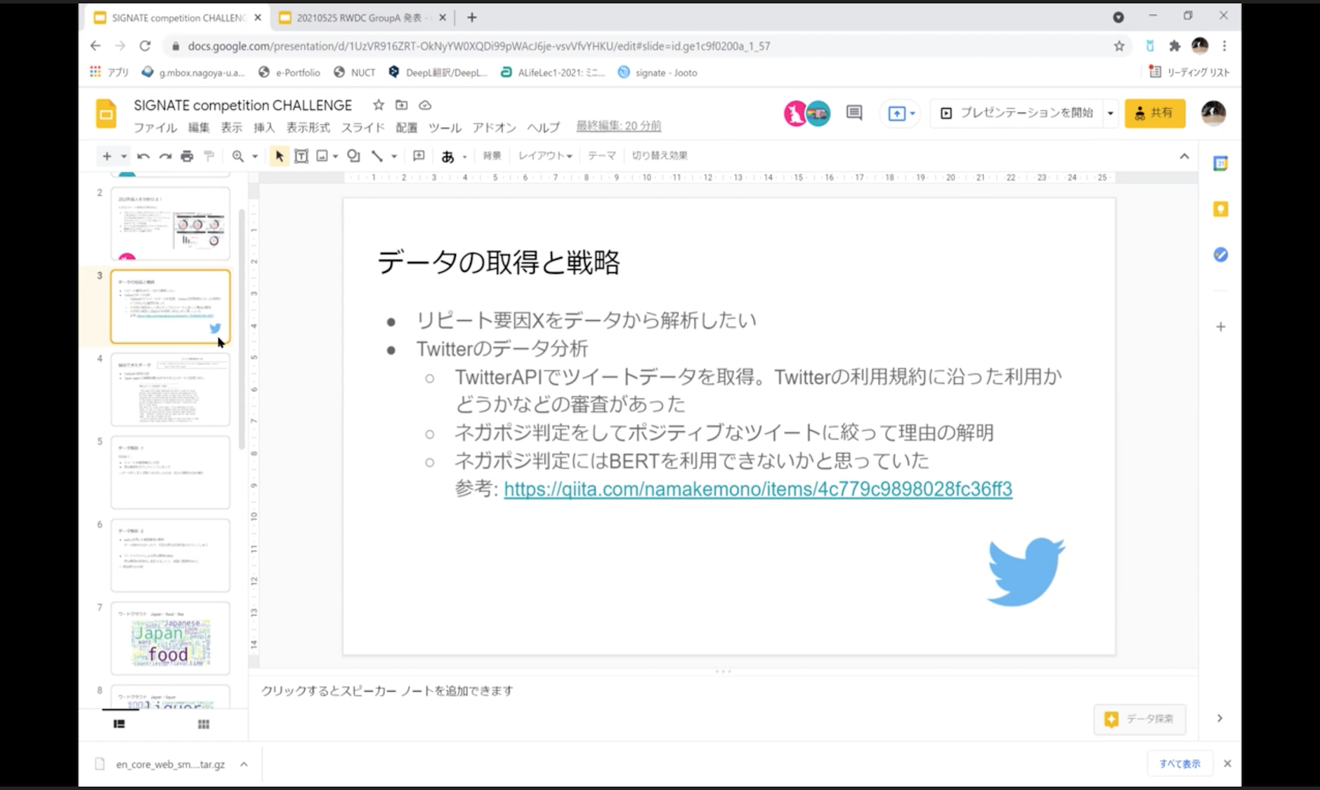 この特別企画は、3人のRWDC履修生によって企画された特別なプロジェクトです。内容は、履修生がチームを組み、国内で実施されているデータ分析コンペ「Signate」に挑戦することです。本企画の目的はこの企画を通じて履修生にリーダーシップと機械学習の能力を向上させることです。まず、4期生の神野悦太郎が「Signate」のデータ課題の説明を行いました。次に、履修生とメンターは2つのグループに分かれ、自分のグループがどのコンペに挑戦するのかについて熱い議論を交わしました。最後に、両グループのリーダーは自分のグループが挑戦するテーマを発表しました。