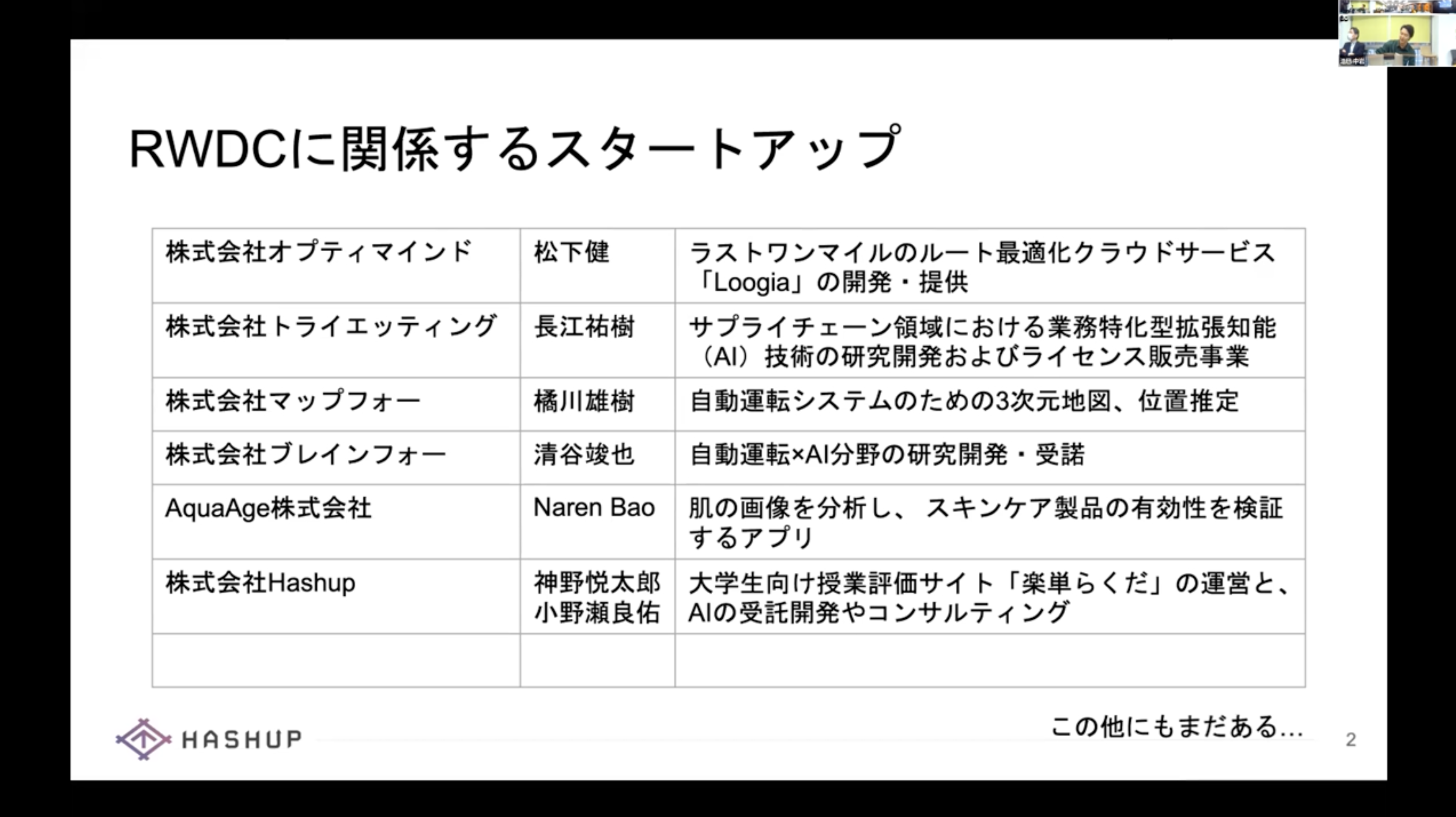 実世界データ循環学リーダー人材養成プログラムからは、 履修生による多くのスタートアップ企業が創出され、 その多くは現在も活動を継続し、発展しております。 今回から、本プログラム発のスタートアップを起業した修了生・履修生により、 学生による起業の意義や取り組みを知ってもらったうえで、 履修生による起業プロジェクトを考えさせるセッションである、 スタートアップ入門講座シリーズの第1回目を実施することとなりました。 これにより、若手の本プログラム履修生に、 先輩起業家による経験を語ってもらうことで、スタートアップについて知ってもらうとともに、 自ら起業することの意義などを理解してもらい、多くの先輩履修生同様に、 起業について身近に思ってもらうことを目的としています。 初回は、4期生で株式会社HashupのCEOである神野悦太郎さんが、以下の項目で1時間の講義を行いました。