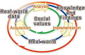 We believe that a new academic field is necessary to create data circulation for the following two reasons: First, creating new social values requires methodologies in fields that handle more fundamental values, including convenience, joy, health, and affluence; that is, engineering (convenience), information science (joy), medicine (health), and economics (affluence). Second, generating a circulation between desires of users and innovative products and services, requires that three functions be integrated: acquisition, analysis, and implementation. The acquisition function gathers the input of users as digital data through observations of various real-world phenomena. The analysis function evaluates this digital data using information science, while the implementation function develops the analysis results into new products and services. In other words, this new academic field encompasses the fields of engineering, information science, medicine, and economics to handle acquisition, analysis, and implementation of real-world data.