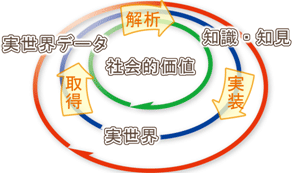 我々は、以下の2つの理由から、この循環を組織的に作り出すためには、新しい学問領域が必要と考える。第一に、社会的価値を創造するためには、「便利、楽しさ、健康、豊かさ」といった、より根元的な価値を担う、工学(便利)、情報科学(楽しさ)、医学(健康)、経済学(豊かさ)の方法論が必要であること。第二に、「受け手の望み」と「新しい製品やサービス」の間に循環を生み出すために、受け手の望みを、実世界の様々な現象の観測などを通じてディジタルデータとして「取得」し、これを情報技術を利用して「解析」し、解析の結果を新たな製品やサービスとして「実装」するという、3つの機能(取得、解析、実装)を総合する必要があること。言いかえれば、工学、情報科学、医学、経済学の分野に跨り、実世界データの「取得、解析、実装」を扱う学問領域が必要である。